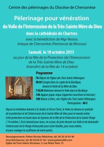 В субботу 10 октября 2015 года, в день празднования Покрова (Заступничества) Пресвятой Богородицы (перенос с 14 октября), по благословению преосвященнейшего Нестора, епископа Корсунского (Московский Патриархат) состоится паломничество для поклонения Плату (Покрову) Пресвятой Богородицы в город Шартр.