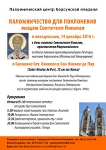 В понедельник 19 декабря 2016г., в день памяти Святителя Николая, архиепископа Мирликийского, по благословению преосвященнейшего Нестора, епископа Корсунского (Московский Патриархат) в Базилике Свт. Николая в Сен-Николя де Пор состоится торжественная Литургия св. Иоанна Златоустого.
