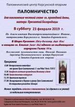 В субботу 23 февраля 2019 г. по благословению Высокопреосвященнейшего Иоанна, митрополита Корсунского и Западно- Европейского, состоялась Божественная Литургия в Шири-Урскам перед мощами св. праведной Анны.