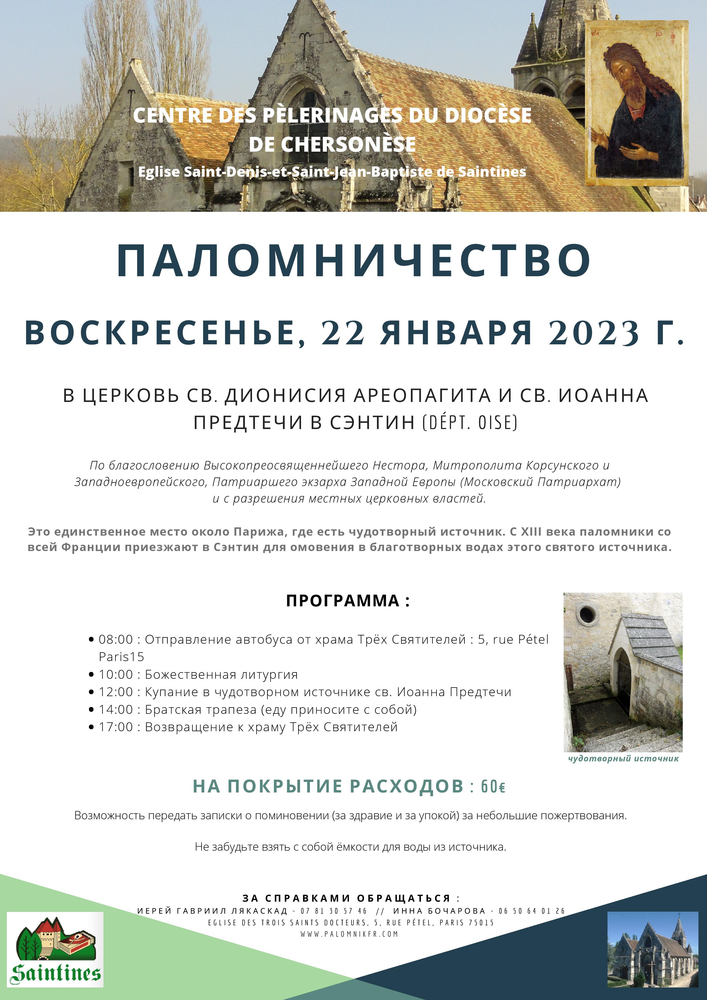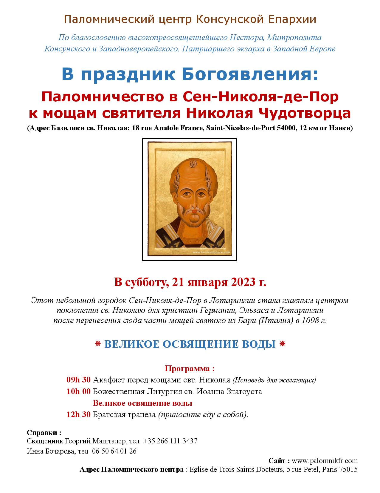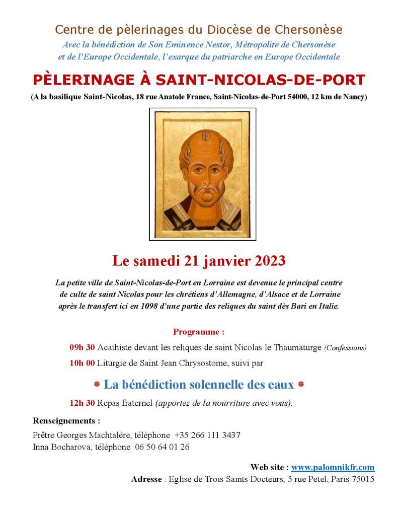 1) В субботу, 21 января, в праздник Богоявления – Паломничество для поклонения мощам святителя Николая, Мирликийского чудотворца в Сен-Николя-де-Пор.
