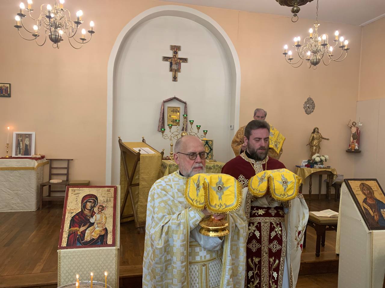 После традиционного Акафиста перед мощами святителя Николая в Базилике была отслужена Божественная Литургия. Служили два священника – отец Габриэль Лякаскад и отец Валентин Палюх, им помогал диакон Михаил Комаров-Курлов и алтарник Димитрий. Хором руководила Инна Бочарова. Сугубо поминали отца Николая – основателя прихода.