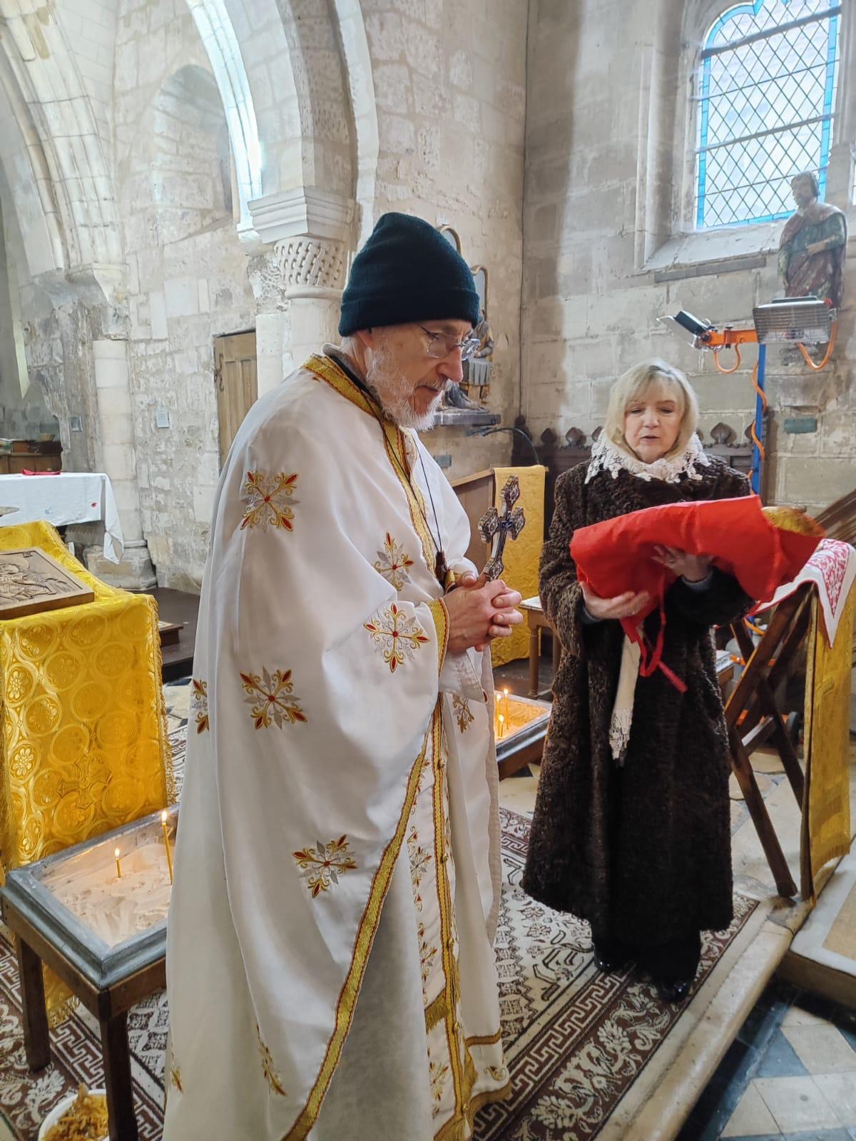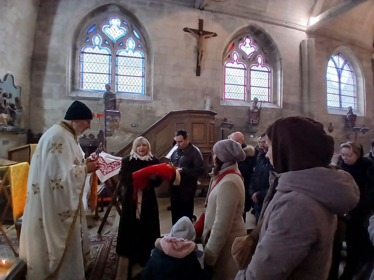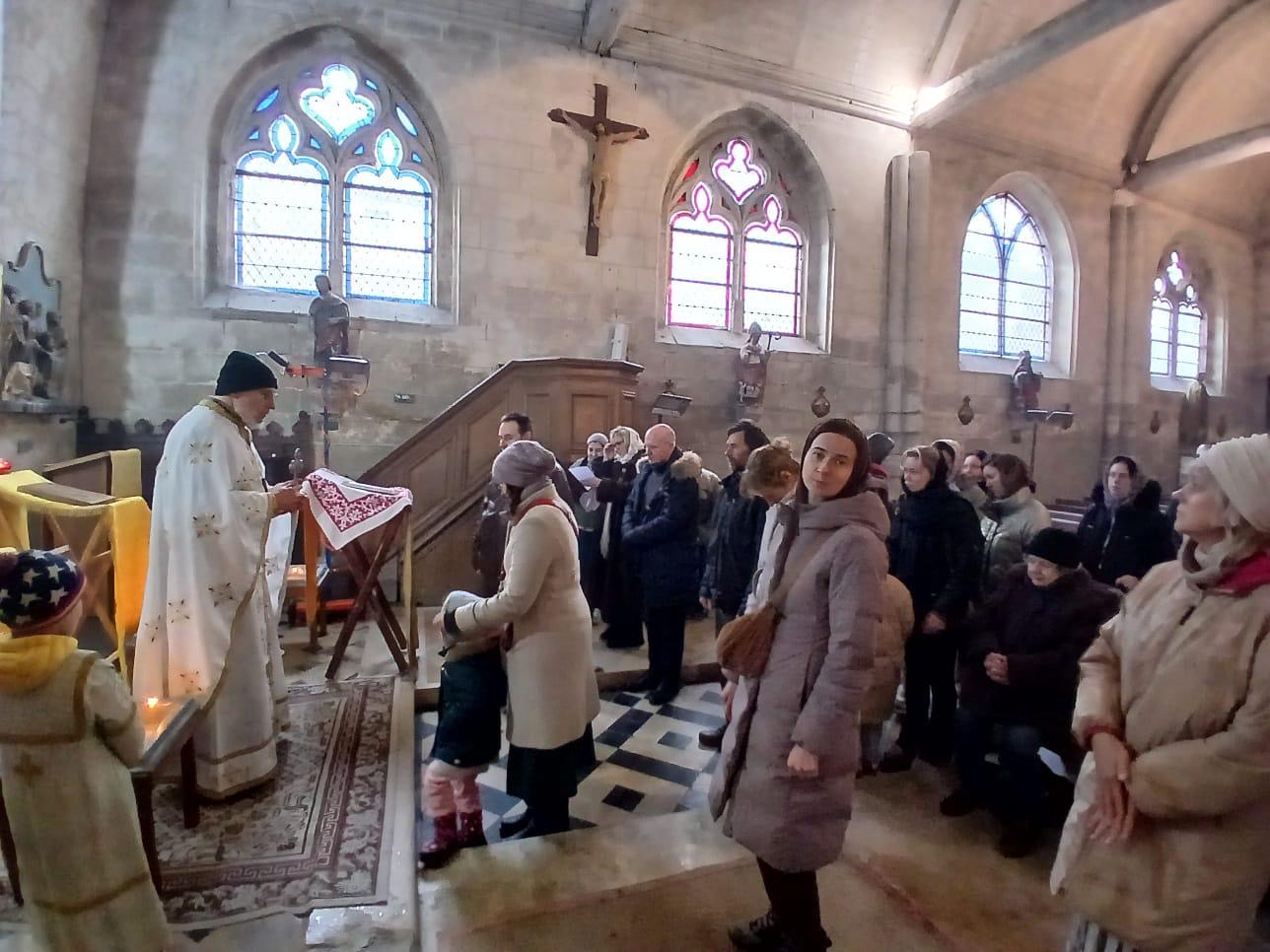 Божественную Литургию совершил настоятель православного прихода этой церкви отец Николай Киссельгоф. Хором из певчих разных приходов руководила Инна Бочарова. В основном, собрались паломники из Парижа и парижского региона, но также из Бретани. Несмотря на холодную погоду и отсутствие отопления в этом древнем храме, которому исполнилось более семи веков (!), на службе было много семей с детьми, а также молодежь. Все паломники смогли исповедаться и причаститься.