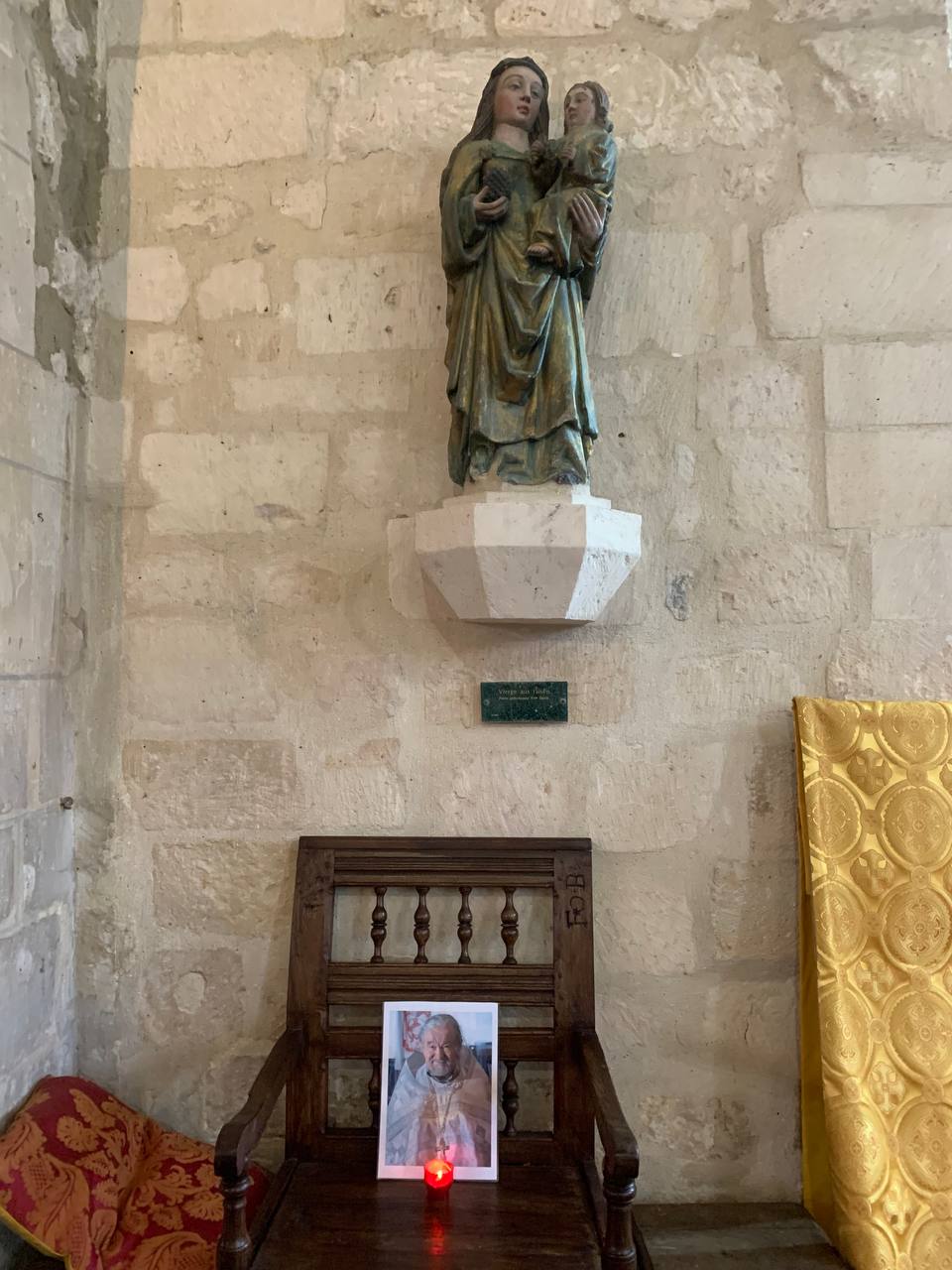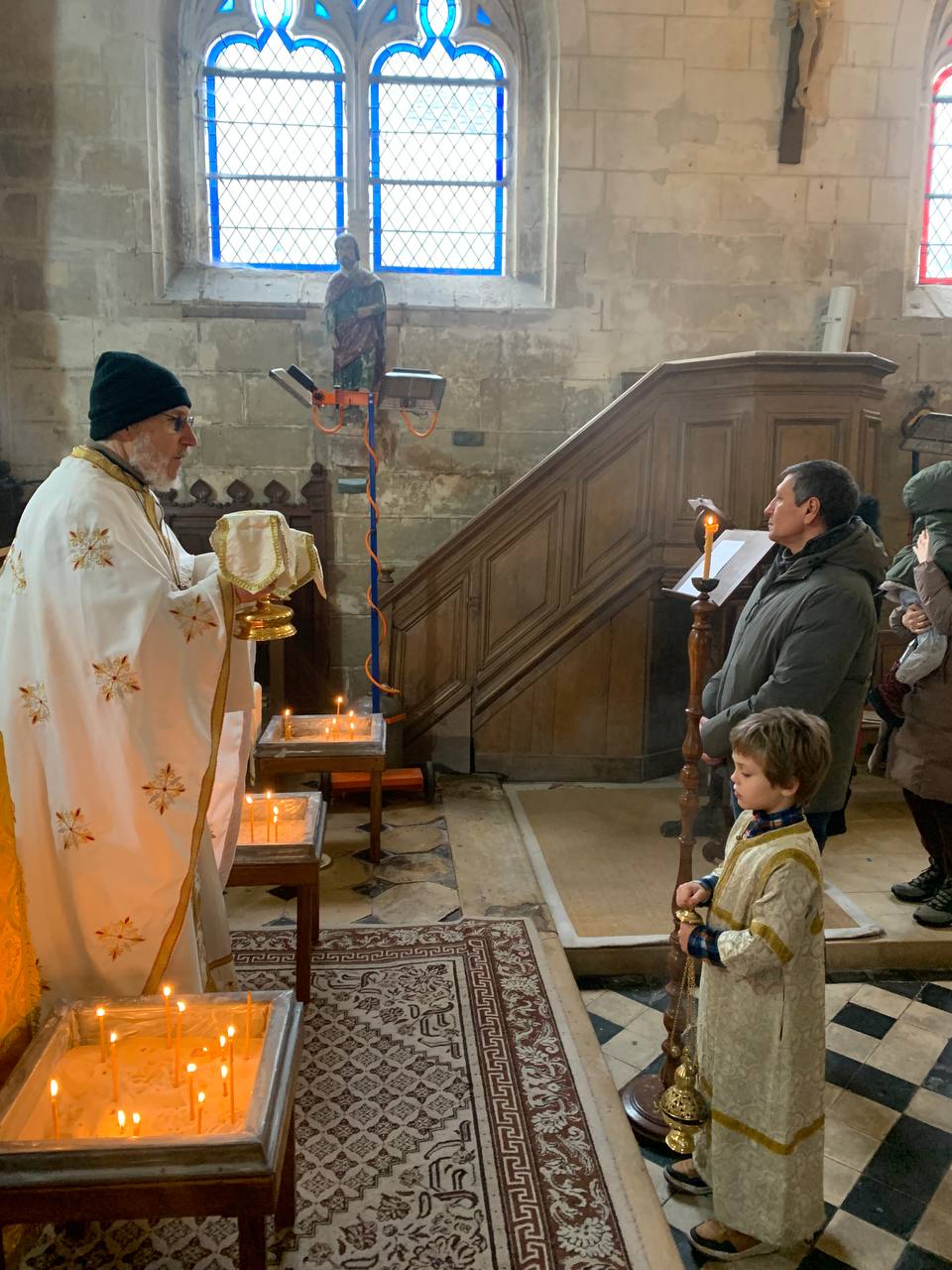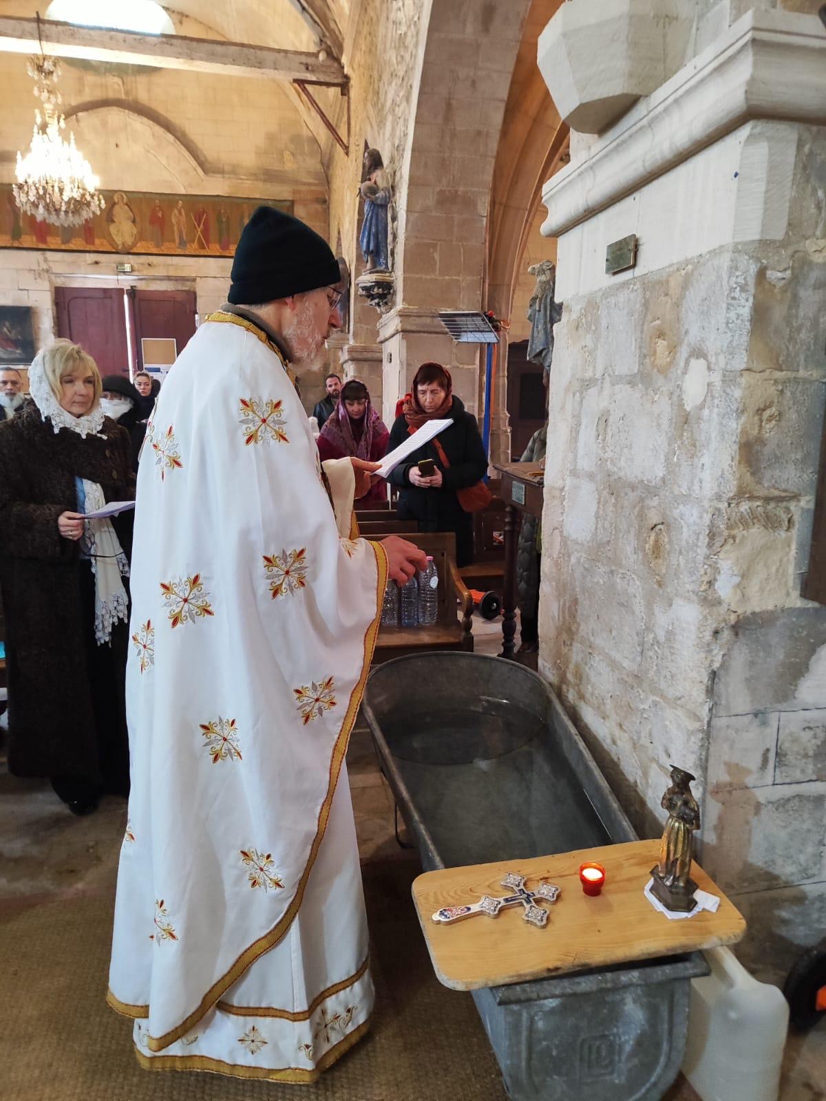 Божественную Литургию совершил настоятель православного прихода этой церкви отец Николай Киссельгоф. Хором из певчих разных приходов руководила Инна Бочарова. В основном, собрались паломники из Парижа и парижского региона, но также из Бретани. Несмотря на холодную погоду и отсутствие отопления в этом древнем храме, которому исполнилось более семи веков (!), на службе было много семей с детьми, а также молодежь. Все паломники смогли исповедаться и причаститься.