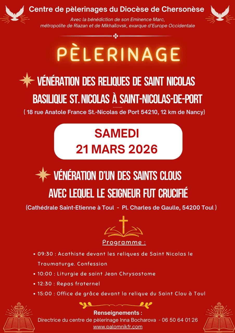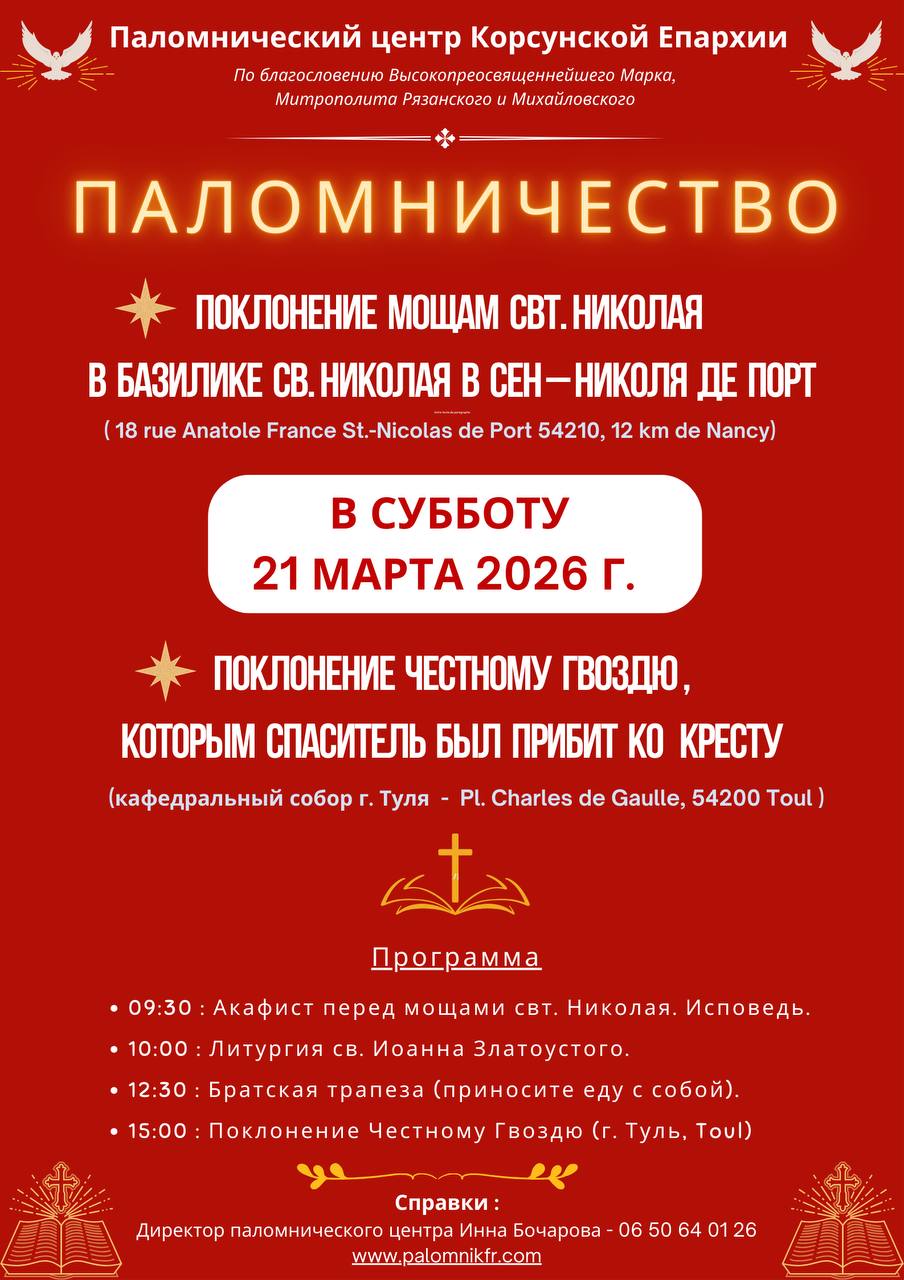 По благословению высокопреосвященнейшего Марка, Митрополита Рязанского и Михайловского, в субботу Крестопоклонной седмицы будет отслужена Божественная Литургия в городе Сен-Николя-де-Пор, в Базилике святителя Николая Чудотворца перед его мощами.