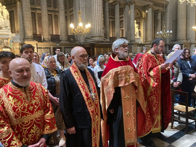 Молебен служили четыре священника: архимандрит Киево-Печерской Лавры Варлаам, иеромонах Иосиф (Павлинчук), настоятель прихода в честь равноапостольных Константина и Елены, отец Габриэль Лякаскад, клирик в честь иконы Пресвятой Богородицы «Всех скорбящих Радость» и святой Женевьевы Парижской, а также настоятель болгарского прихода в Париже отец Иоанн Карагеоргиев.