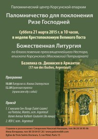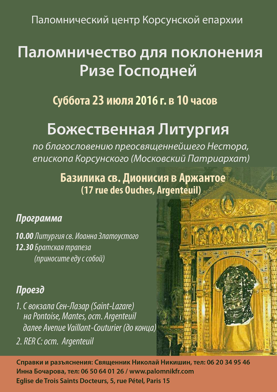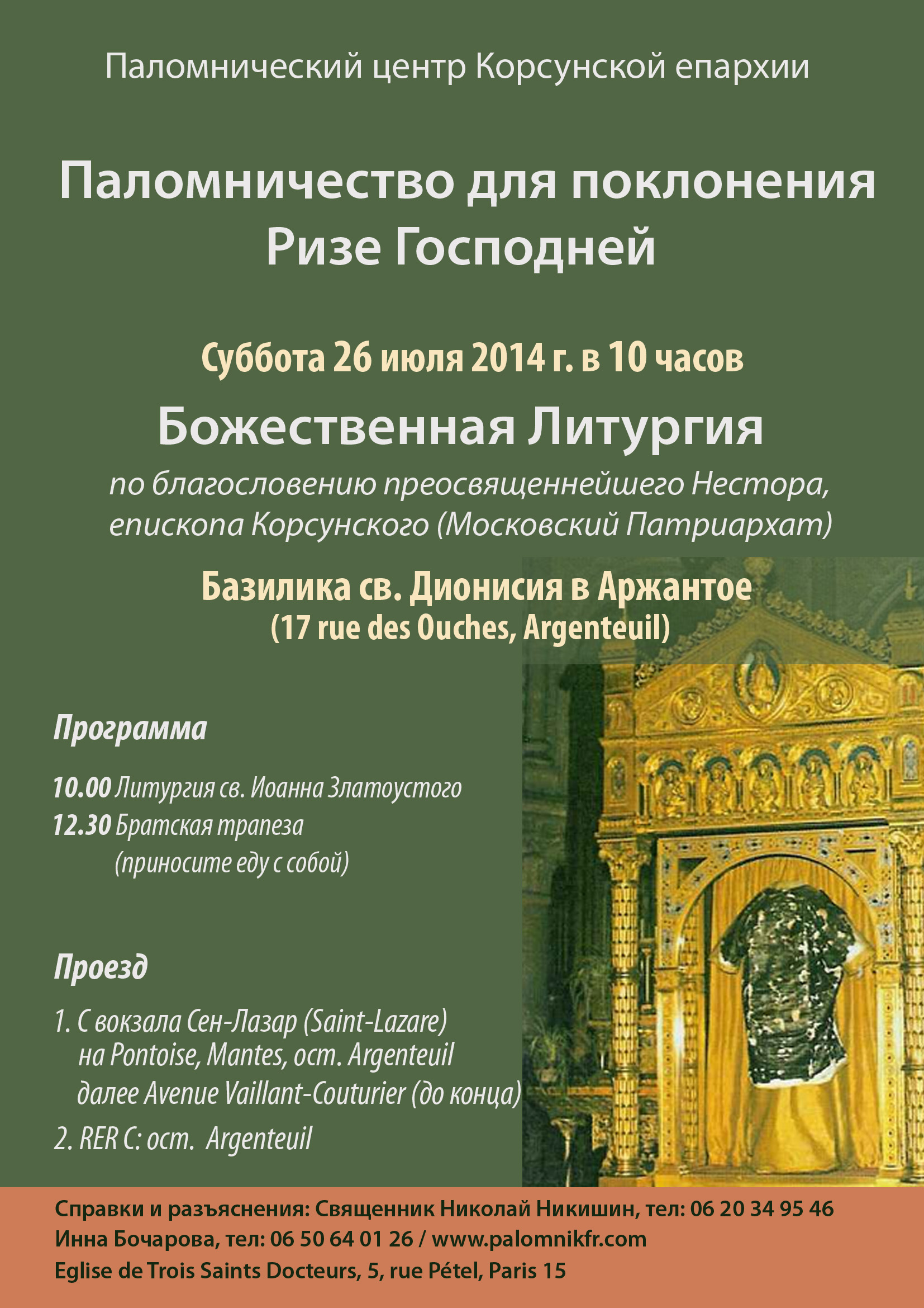 25 июля 2015 года, (23 июля – день памяти положения Ризы Господней в Москве) по благословению Преосвященнейшего Нестора, епископа Корсунского, в базилике Святого Дионисия в коммуне Аржантёй (департамент Валь-д’Уаз) состоялась Божественная Литургия св. Иоанна Златоуста.