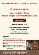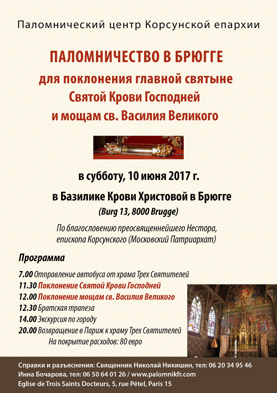 В субботу 10 июня 2017 года, по благословению преосвященнейшего Нестора, епископа Корсунского (Московский Патриархат), состоится паломничество в Базилику Крови Христовой в г. Брюгге (Бельгия) для поклонения главной святыне Святой Крови Господней, а также мощам св. Василия Великого.