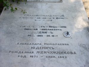 В Ницце, как и повсюду во Франции, покоится их немало. На кладбище Кокад при входе в часовню можно прочитать фамилии более двухсот пятидесяти наших соотечественников, похороненных на холме Кокад, а также на других кладбищах в окрестностях Ниццы. А сколько еще тех, кого не учли в этом списке? Почти все из них прошли через три войны начала 20 века – Русско-японскую, Первую мировую и Гражданскую войну в России. Имена многих вошли в историю, и их знает каждый, как, например, похороненные здесь в Ницце генерал Николай Николаевич Юденич