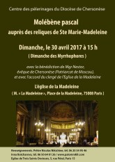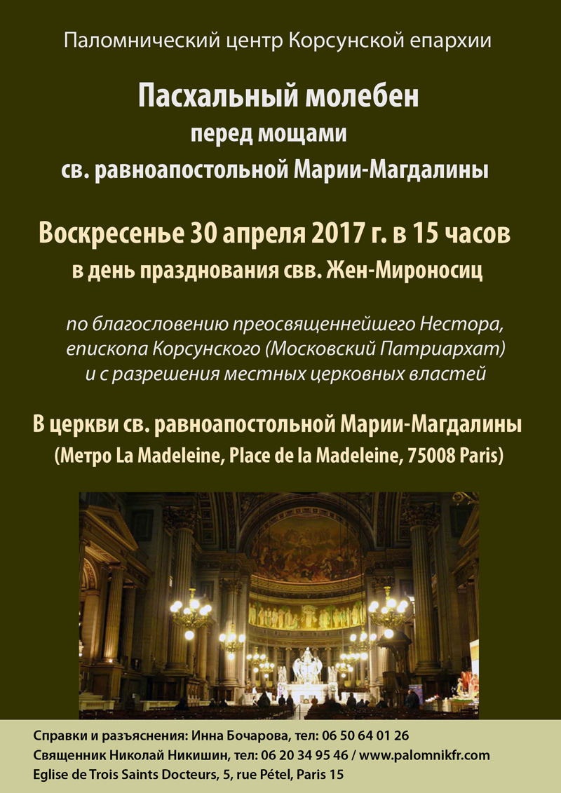В церкви св. равноапостольной Марии-Магдалины ( метро: La Madeleine , Place de la Madeleine, 75008 Paris) был отслужен пасхальный молебен перед мощами самой известной из жен-мироносиц, провозвестнице Воскресения Христова .