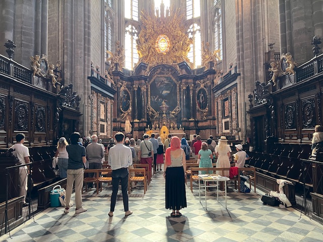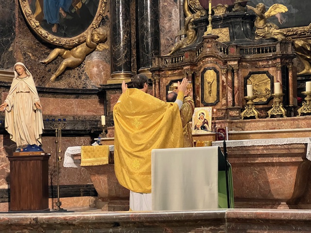 Для православного богослужения нам выделили главный престол. Божественную Литургию совершил настоятель Свято-Николаевского собора в Ницце протоиерей Андрей Елисеев. Ему сослужил протодиакон собора отец Иоанн Буздуган. Прекрасно пел сборный хор под руководством регента Свято-Николаевского собора Елизаветы.