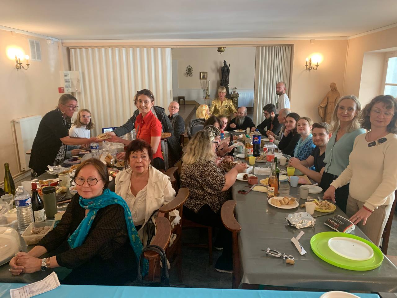 После богослужения все желающие собрались за столом на праздничную трапезу, где многие вспоминали и рассказывали истории о том, как и когда Господь привел и соединил нас всех в этом святом месте.