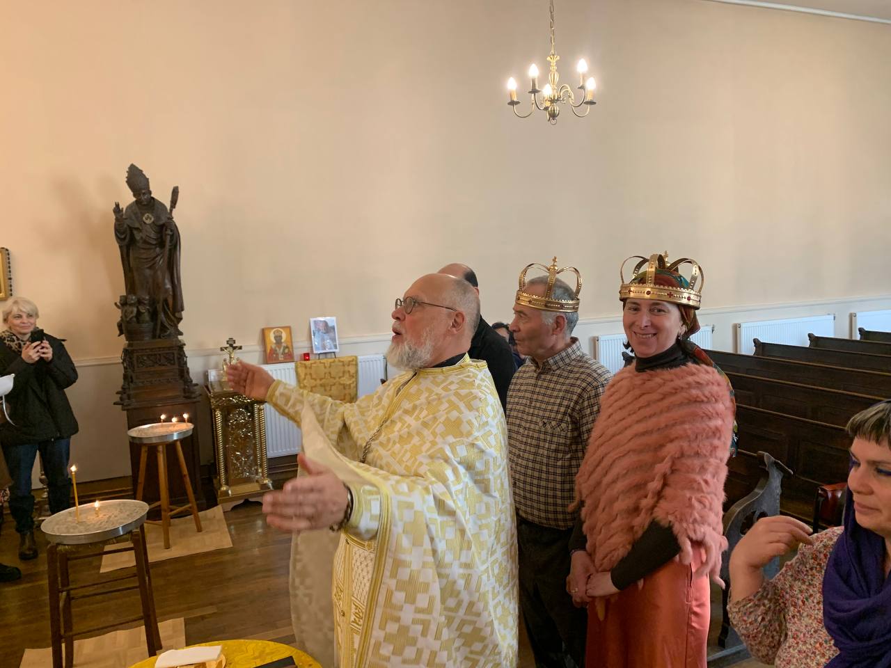 Приехали паломники из Парижа, Страсбурга, Метца, Люневиля, Нанси и других мест. В этот раз особенно много собралось представителей грузинской диаспоры во главе с монахом Варсонофием. А после богослужения состоялось венчание грузинской пары – многолетних постоянных прихожан нашего Свято-Никольского прихода. Празднование продолжилось за столом: со свадебным тортом и грузинскими песнопениями. Также все поздравили с днями рождений Анну, Вадима и Павла, дружно спели им «Многая лета».
