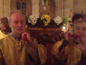 По благословению Высокопреосвященнейшего Антония, митрополита Корсунского и Западно- Европейского, и согласия настоятеля базилики аббата Александра Томассена, перед чудотворными мощами этого великого угодника Божия, состоялась Божественная Литургия.