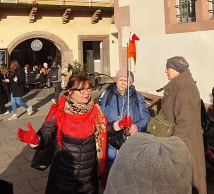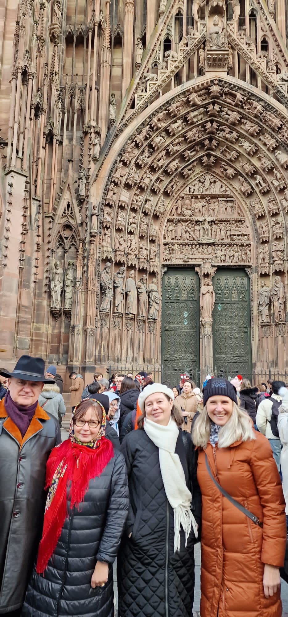 В завершение, паломники из Висбадена посетили собор Пресвятой Богородицы (Notre Dame de Strasbourg), интерьер которого в канун Рождества украшает уникальная серия тканых ковров, посвященных жизни Христа и Богородицы. В этот же период в соборе можно видеть вертеп Рождества Христова, созданный местными скульпторами и резчиками по дереву. Гости сделали памятную фотографию на фоне Страсбургского Собора. Экскурсию провела православный гид в Страсбурге Ирина Макий.