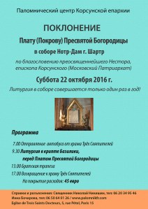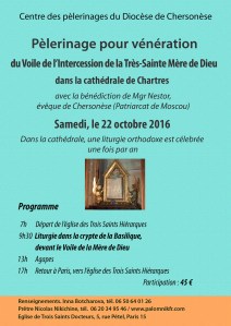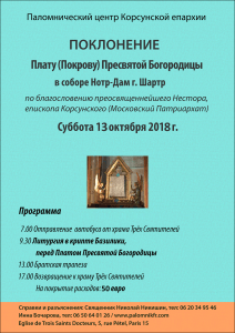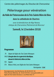 В субботу, 9 октября, по благословению высокопреосвященнейшего Антония, Митрополита Корсунского и Западноевропейского, а также по договоренности с местными церковными властями, состоялось традиционное для этого периода года паломничество в Шартр к Плату (Покрову) Пресвятой Богородицы. Такие православные паломничества в преддверии праздника Покрова Пресвятой Богородицы (14 октября) стали совершаться с 2002 года, то есть фактически 20 лет назад, по инициативе руководителя Паломнического центра Корсунской епархии покойного отца Николая Никишина.