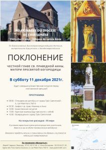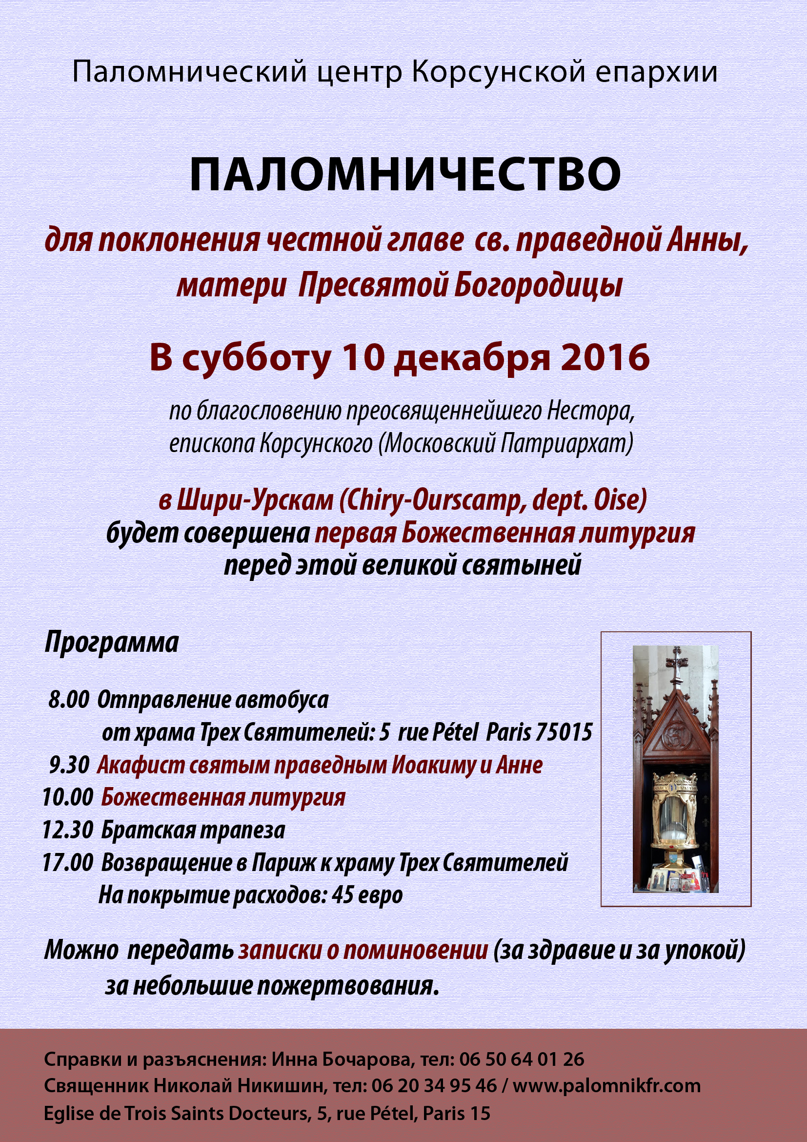 На 10 декември 2016 година бе отслужена първата православна света литургия пред мощите на света Анна, майката на Пресвета Богородица, които се съхраняват в катедралата на френското градче Шири Урскам, недалеч от Кампиен. Миряни от Белгия и Франция, между които и група от нашата църковна община, се стекоха да се поклонят пред светинята и да се причастят с тялото и кръвта Христови. Тайнство, колкото духовно, толкова и реално и въплътено, поради въплъщението на Спасителя, станало факт благодарение пречиста Дева Мария, родена от света Анна, Неговата баба по плът. В края на светата литургия, огласена от юношеския хор на църквата « Рождество Христово » от гр. Антверпен, отец Николай Никишин, който от дълги години организира поклонически пътувания до православни светини в цяла Франция, подчерта в своето слово помощта, която мощите на света Анна оказват на всички, особенно на бездетните майки, поради факта, че самата тя е приминала пободеносно през това тежко изпитание, надявайки се въпреки всяка надежда и раждайки Майката на всички нас. А Пресвета Богородица, като всяка майка, ни приема водейки ни за ръка към своя единороден Син, въпреки нашето недостойнство и особено тогава когато го осъзнаем, когато видим бездната която ни разделя от Него и в страха си се сгушим в скута и и продължим напред с Нея към Него, въпреки всичко… въпреки нас…