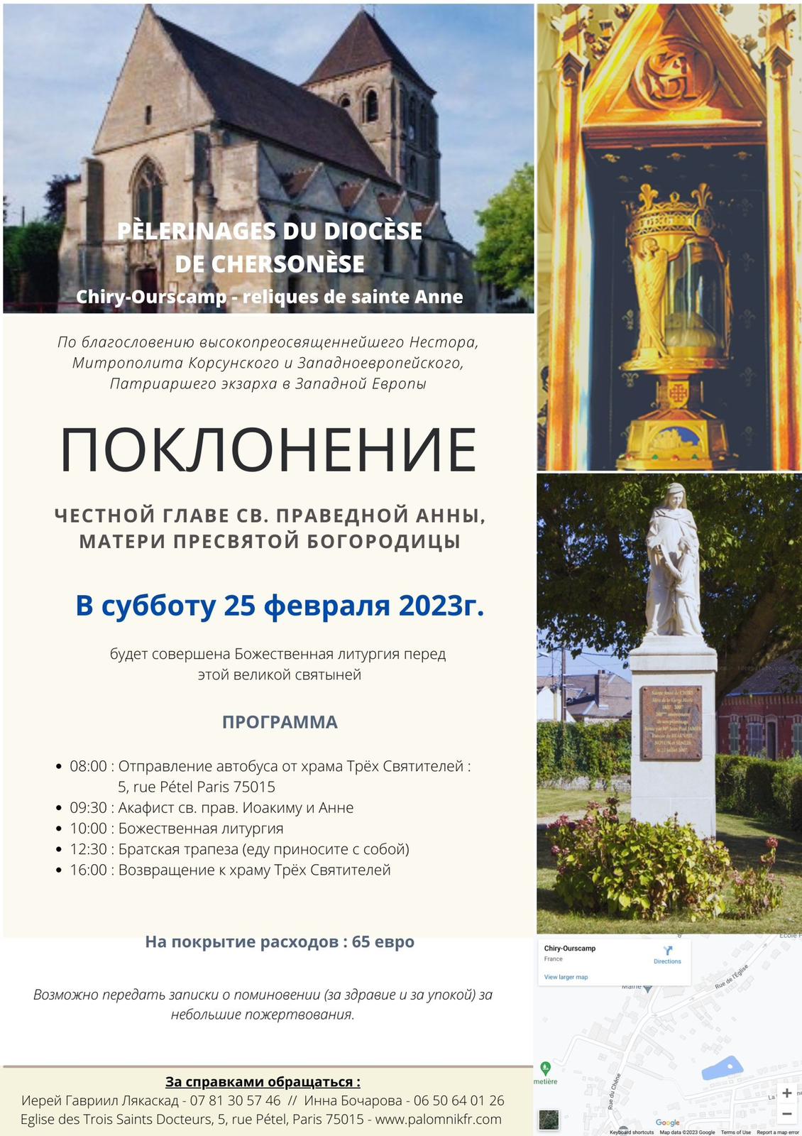 В субботу, 25 февраля, состоялось паломничество в Шири-Урскам, город в департаменте Уаз, удостоенный чести хранить Главу святой праведной Анны, матери Пресвятой Богородицы. После пения акафиста святым Иоакиму и Анне и чтения часов Литургия совершалась на двух языках, французском и церковно-славянском. Служил отец Гавриил Лякаскад.