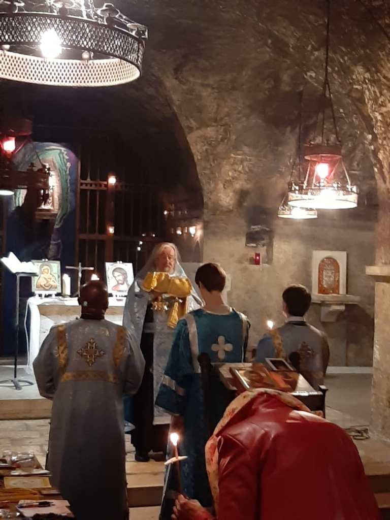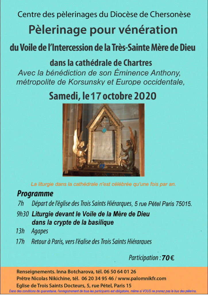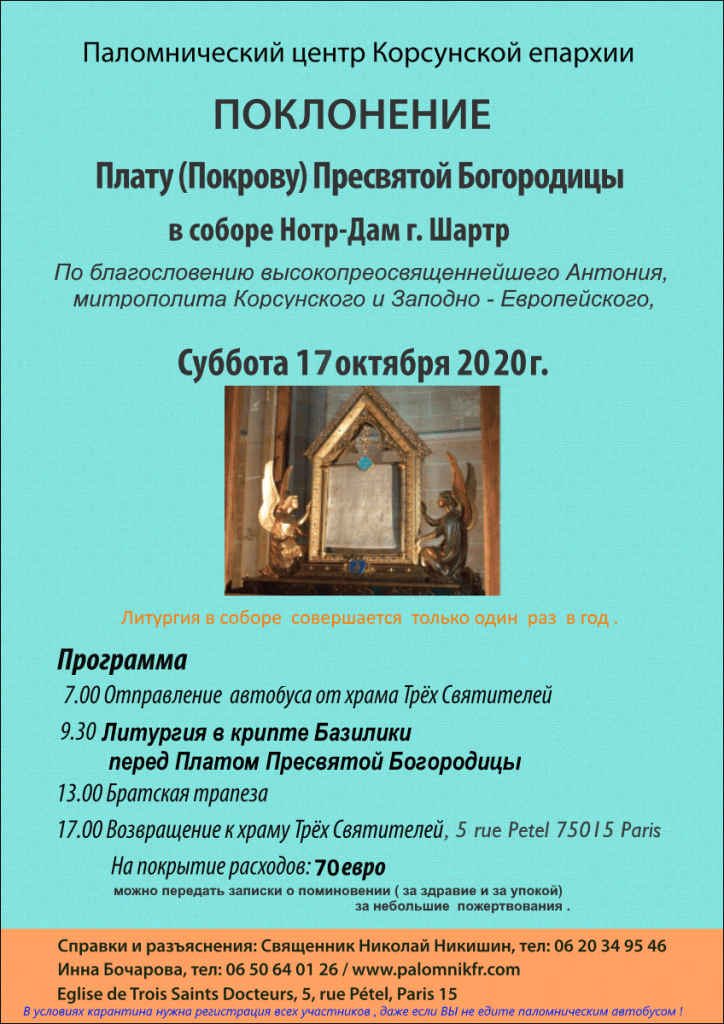 В субботу 17 октября 2020 г. по благословению по благословению Высокопреосвященнейшего Антония, митрополита Корсунского и Западно- Европейского и согласия настоятеля Кафедрального Собора г. Шартра аббата Блондо состоялась Божественная Литургия перед одной из величайших святынь христианского мира : Платом (Покровом ) Пресвятой Богородицы .