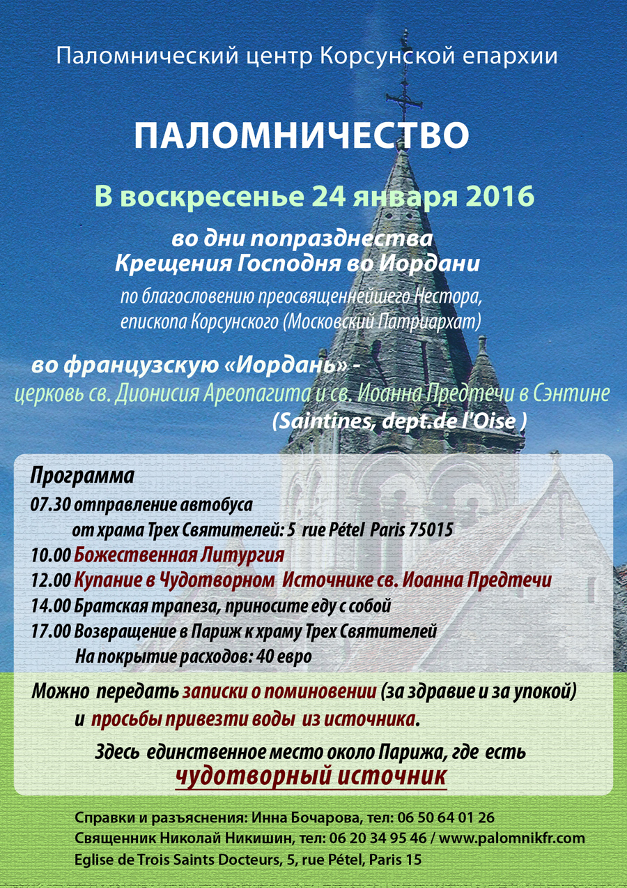 С 1 по 8 апреля 2016 г. по благословению преосвященного Нестора, епископа Корунского, состоялись паломничества епархии Московского Патриархата для поклонения Честной Ризе Господней, которая хранится в базилике св. Дионисия Ареопагита в местечке Аржантёй (15 км. от Парижа).