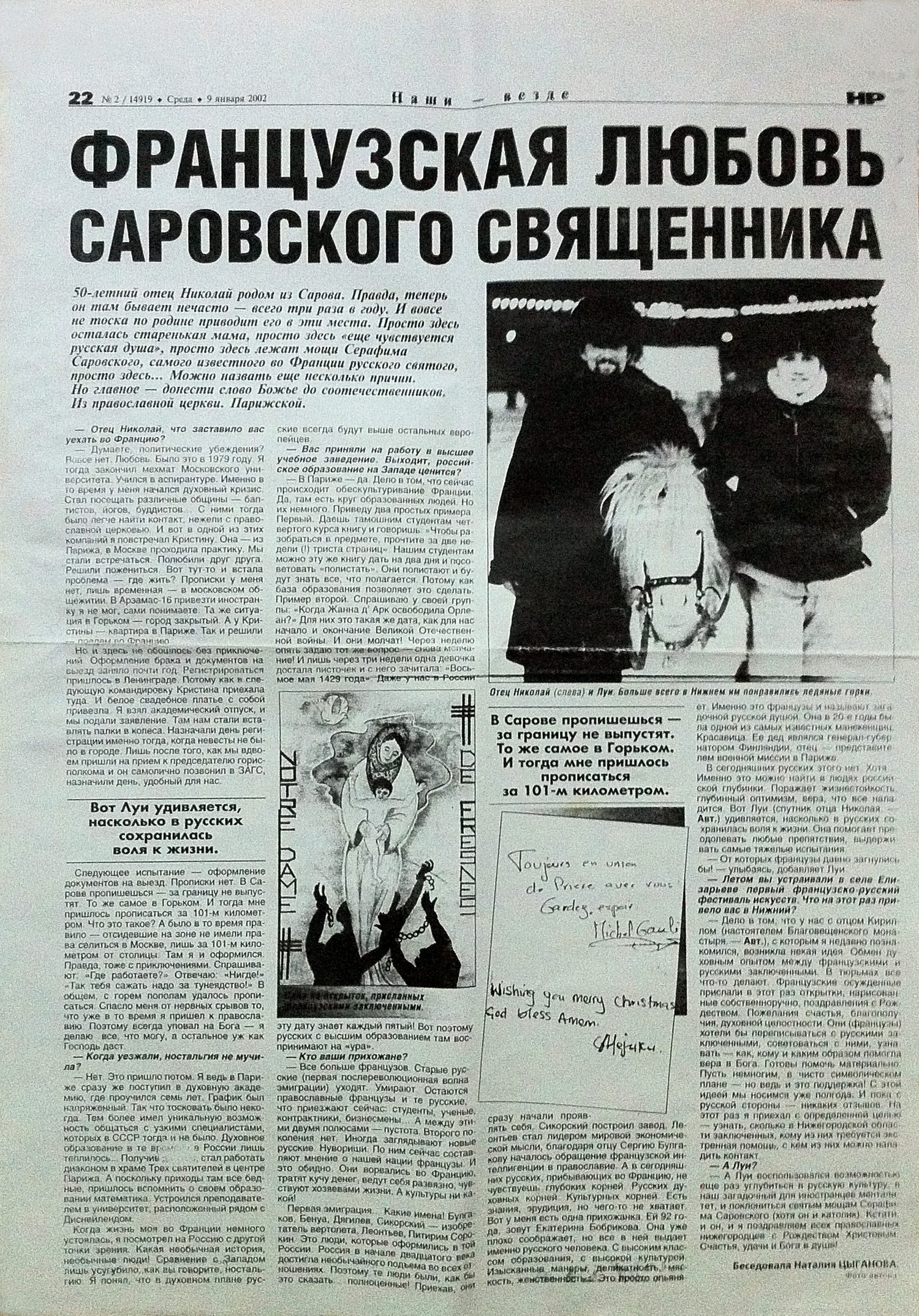 – А Луи воспользовался возможностью еще раз углубиться в русскую культуру, в наш загадочный для иностранцев менталитет, и поклониться святым мощам Серафима Саровского (хотя он и католик). Кстати, и он, и я поздравляем всех православных нижегородцев с Рождеством Христовым. Счастья, удачи и Бога в душе!
