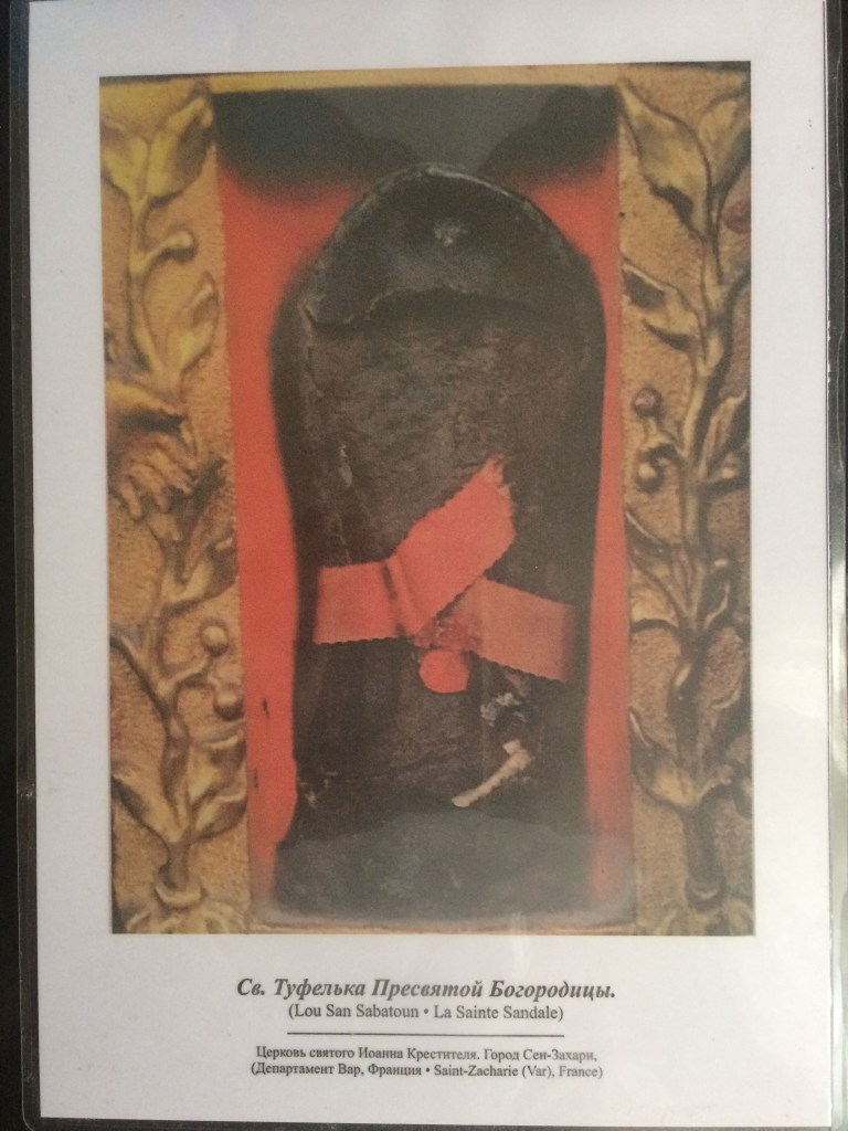 В местечке Сен-Захари (Sainte – Zacharie) (департамент Вар 83640) в церкви Св. Иоанна Предтечи, по крайней мере, с XIII века хранится святыня : св. Туфелька Пресвятой Богородицы. С археологической точки зрения она датируется I-II в. н.э. Она сделана из кожи. Сама туфелька изображена в гербе города.