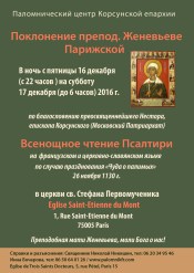 В ночь с пятницы 16 декабря на субботу 17 декабря в 19-й раз прошло Бдение Перед мощами святой Женевьевы, в церкви Сент Этьен дю Мон в 5 округе Парижа! Святая Женевьева издавна славится, как покровительница Парижа! Русские православные почитают её, как свою защитницу и помощницу более, с тех пор как она явилась и исцелила одну больную русскою даму …