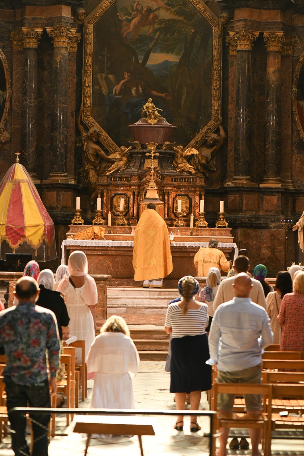 Для православного богослужения нам выделили главный престол. Божественную Литургию совершил настоятель Свято-Николаевского собора в Ницце протоиерей Андрей Елисеев. Ему сослужил протодиакон собора отец Иоанн Буздуган. Прекрасно пел сборный хор под руководством регента Свято-Николаевского собора Елизаветы.