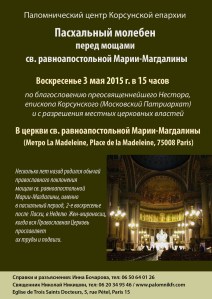 В воскресенье 3 мая 2015 в 15 часов, по благословению преосвященнейшего Нестора, епископа Корсунского (Московский Патриархат) и с разрешения местных церковных властей, в церкви св. равноапостольной Марии-Магдалины (Метро La Madeleine, Place de la Madeleine, 75008 Paris) состоится пасхальный молебен перед мощами св. равноапостольной Марии-Магдалины, этой самой известной из жен-мироносиц, вестницы Воскресения Христова.