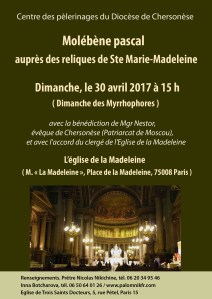 В воскресенье 30 апреля 2017 г. в 15 ч., по благословению Преосвященнейшего Нестора, епископа Корсунского (Московский Патриархат) и с разрешения местных церковных властей, в церкви св. равноапостольной Марии-Магдалины (метро « La Madeleine », Place de la Madeleine, 75008 Paris) состоялся пасхальный молебен перед мощами св. равноапостольной Марии-Магдалины, этой самой известной из жен-мироносиц, вестницы Воскресения Христова.