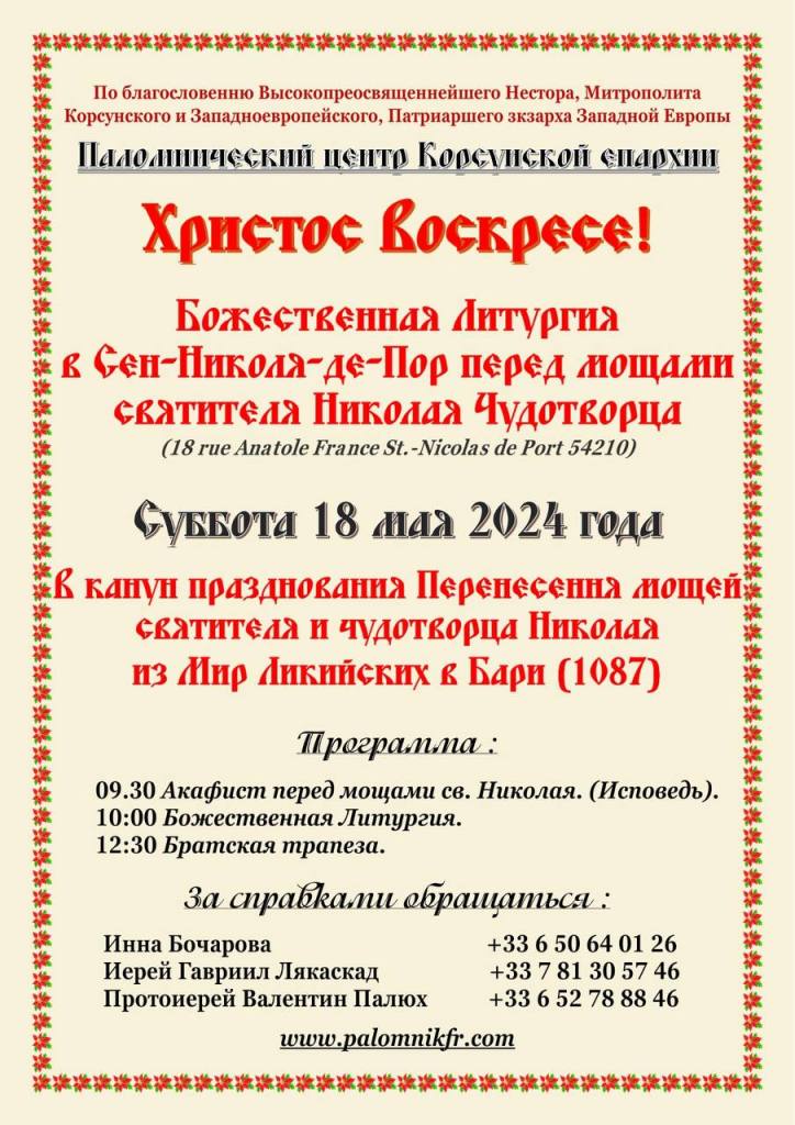 В субботу, 18 мая, в Сен-Николя-де-Пор отпраздновали летний Престольный праздник – день памяти Перенесения мощей святителя Николая Мирликийского Чудотворца в Бари.